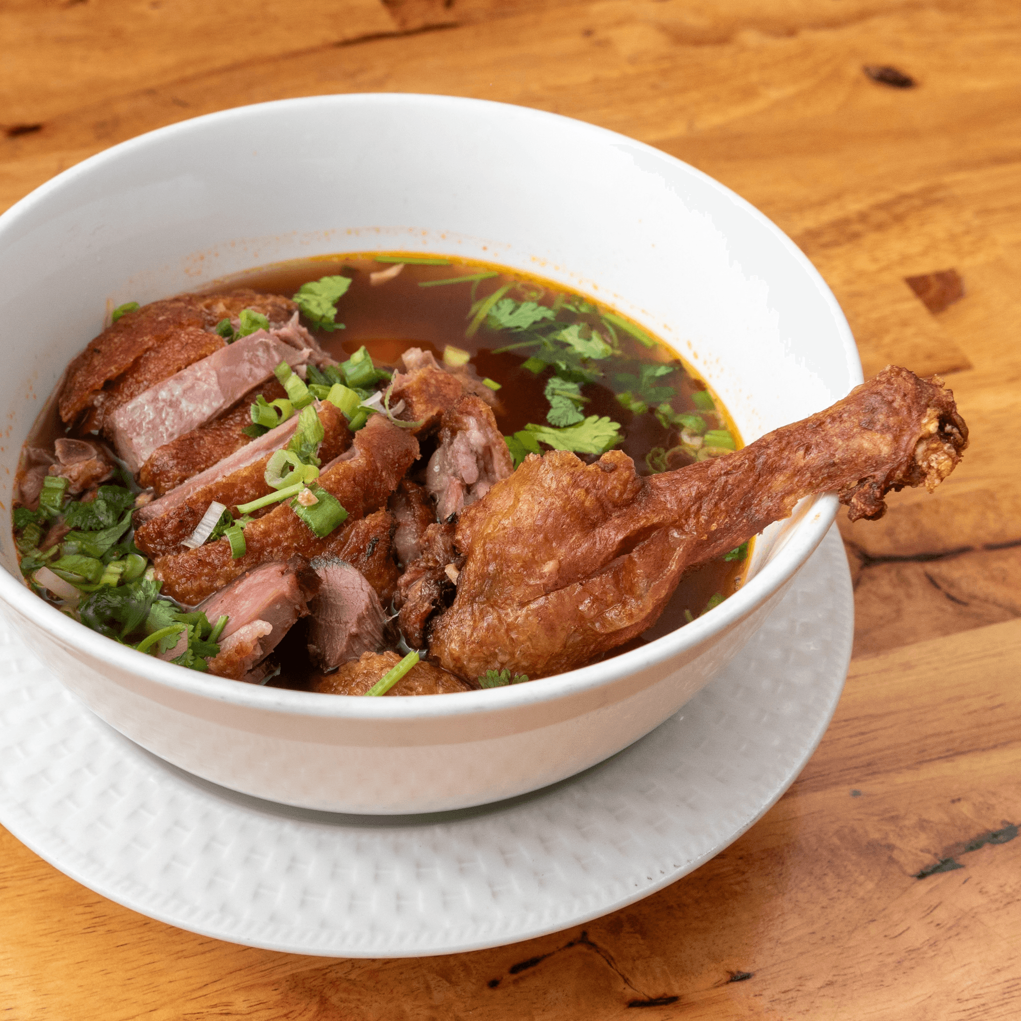 Rice noodles with sliced duck, bean sprout, basil scallion in an brown herb broth