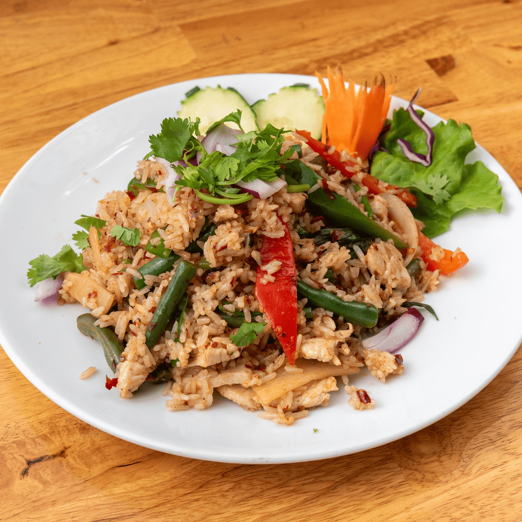 Fried rice with onion, bell pepper, bamboo green bean, and Thai basil