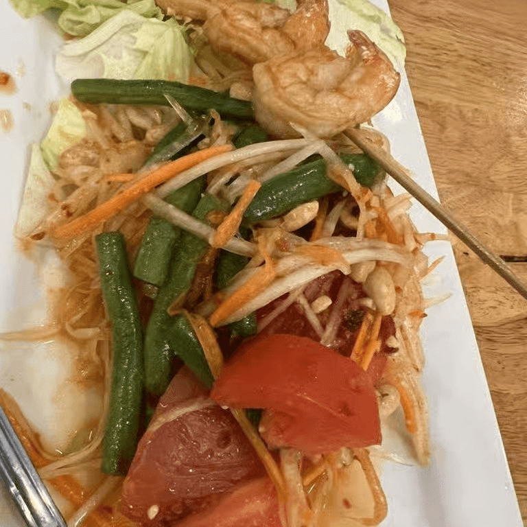 (Papaya salad) green papaya, tomato, carrots, green beans, shrimps and limes tossed with peanuts, palm sugar, and fish sauce, bed of mix salad