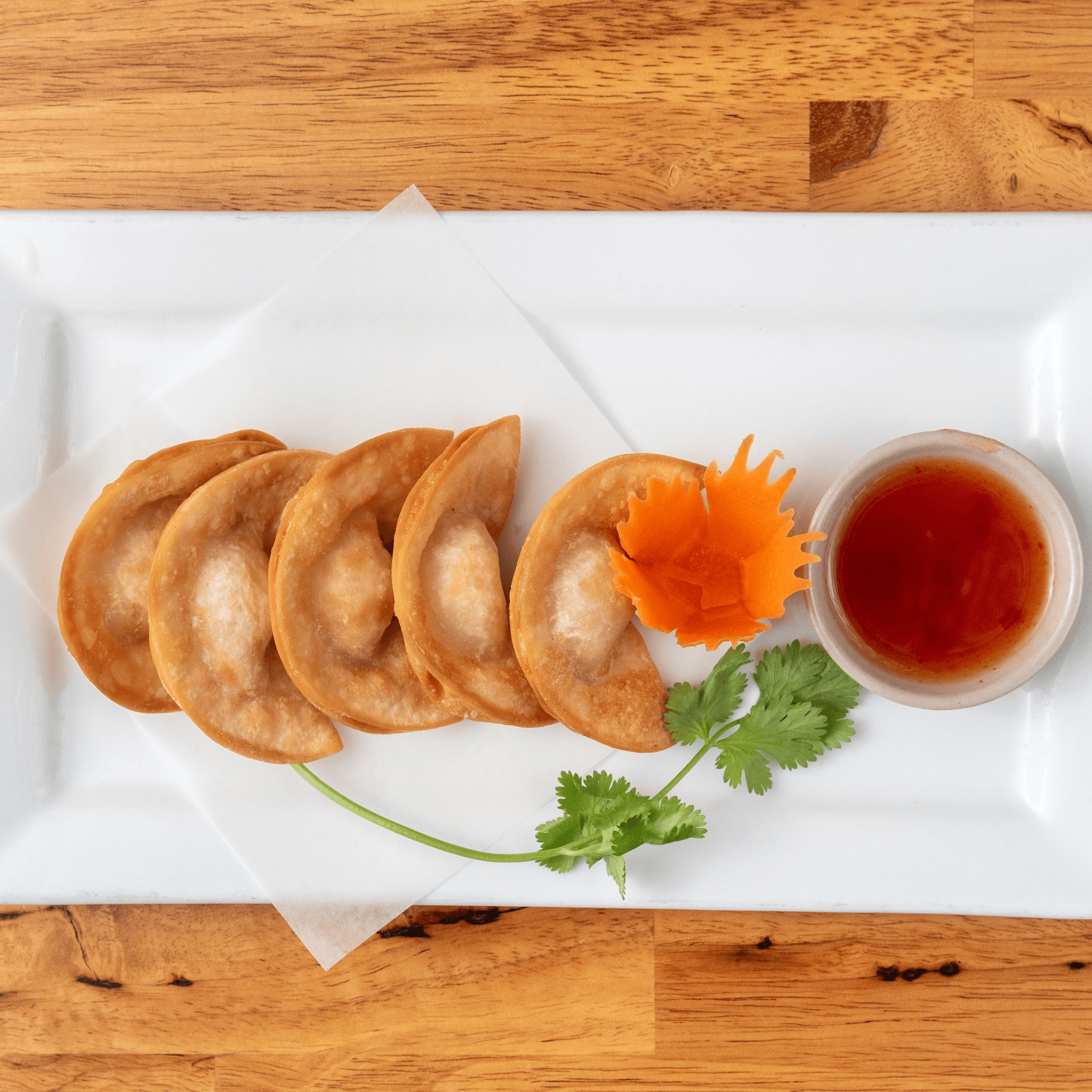 5 pieces - crispy wonton skin stuffed with crab stick, cream cheese. Served with sweet and sour sauce