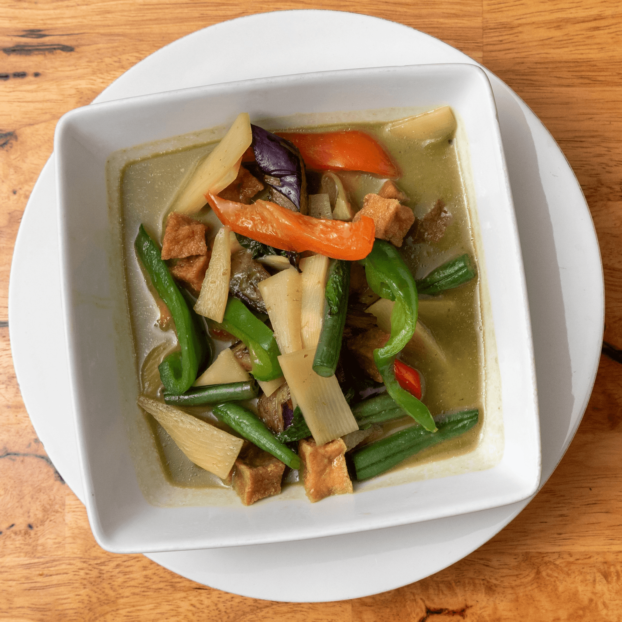 Green curry paste cooked with coconut milk, mix bell, eggplant, and basil