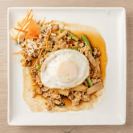 Stir-fried ground chicken with fresh Thai chili, green bean, bamboo, onion, bell peppers, and basil leaves. All Thai rice bowls are served with sear onion, bell pepper