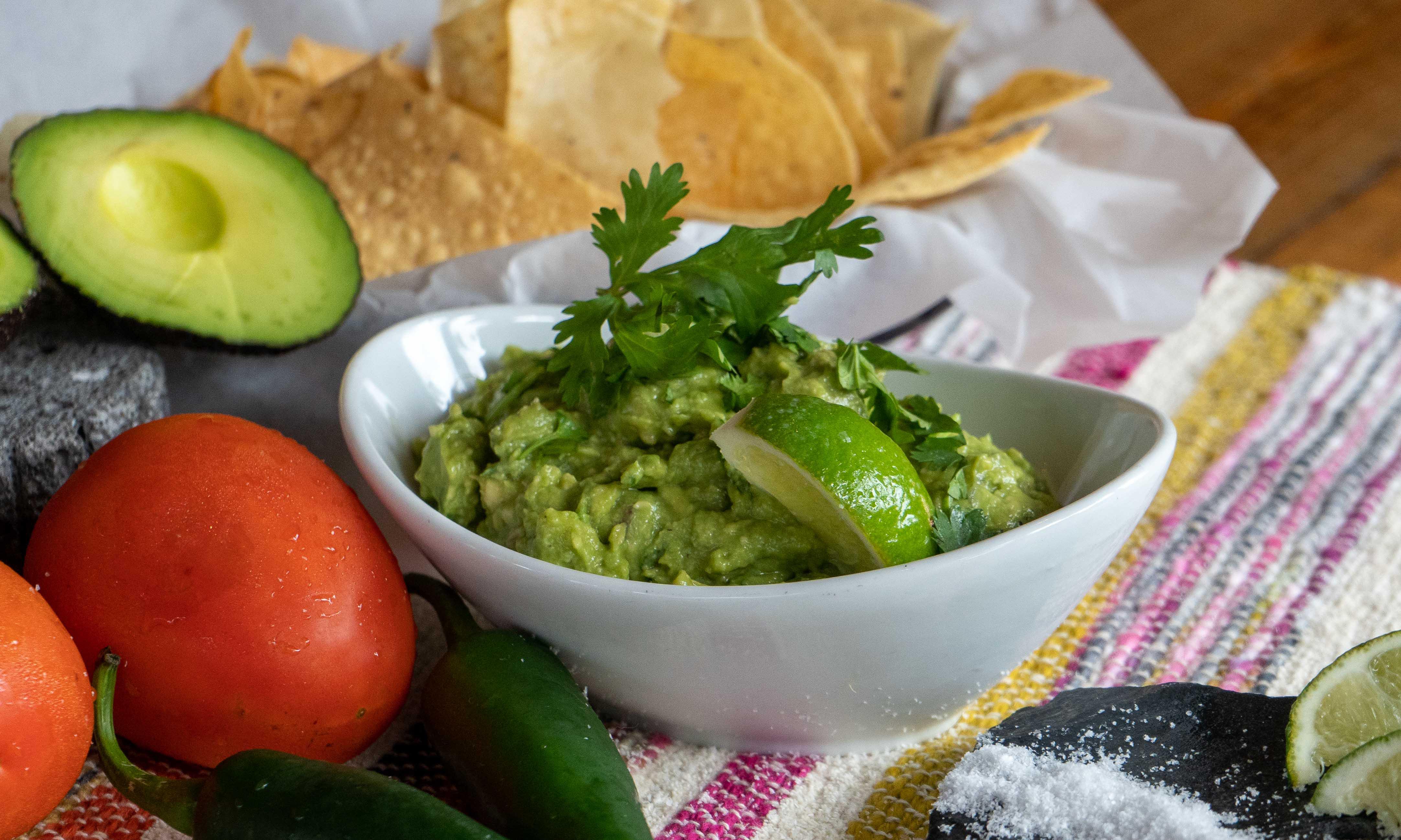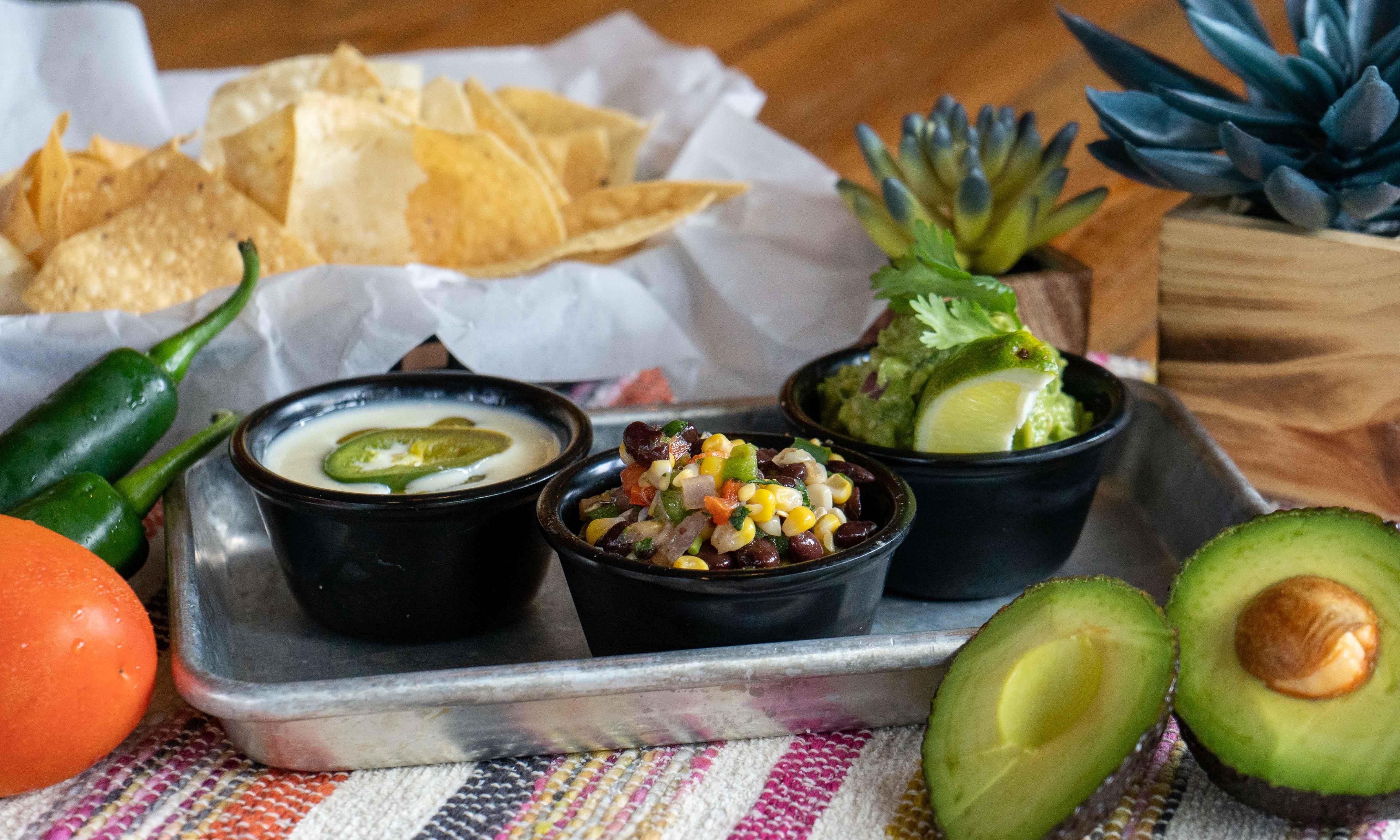 fresh guacamole, salsa verde and queso topped with jalapenos.