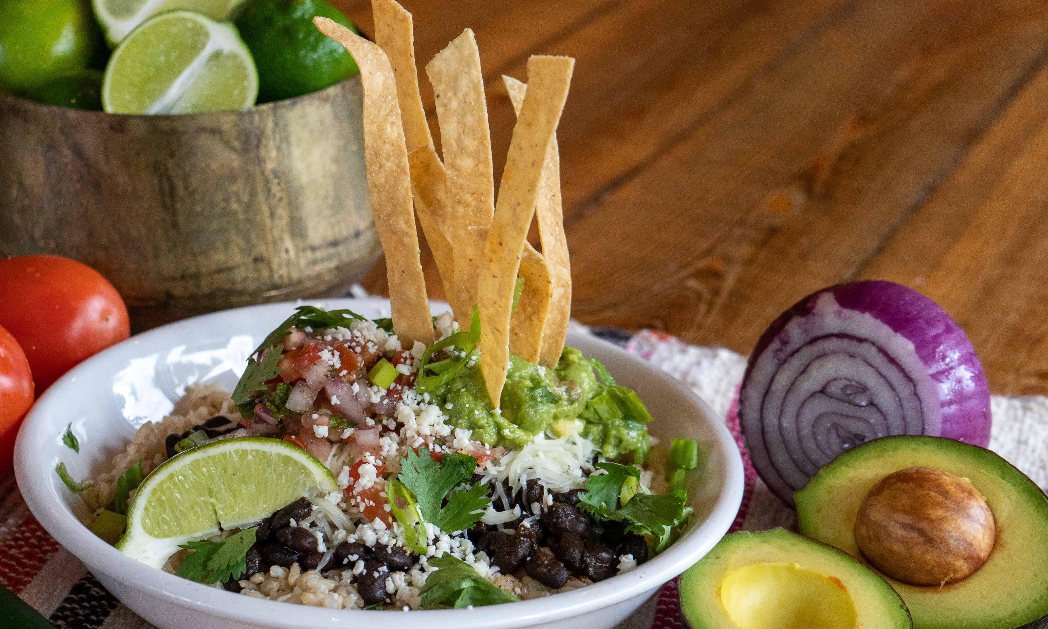 Baja bowls are brown rice, seasoned black beans, jack cheese, pico de gallo, guacamole, crunchy tortilla strips, queso cotija and topped with green onions, fresh lime and cilantro