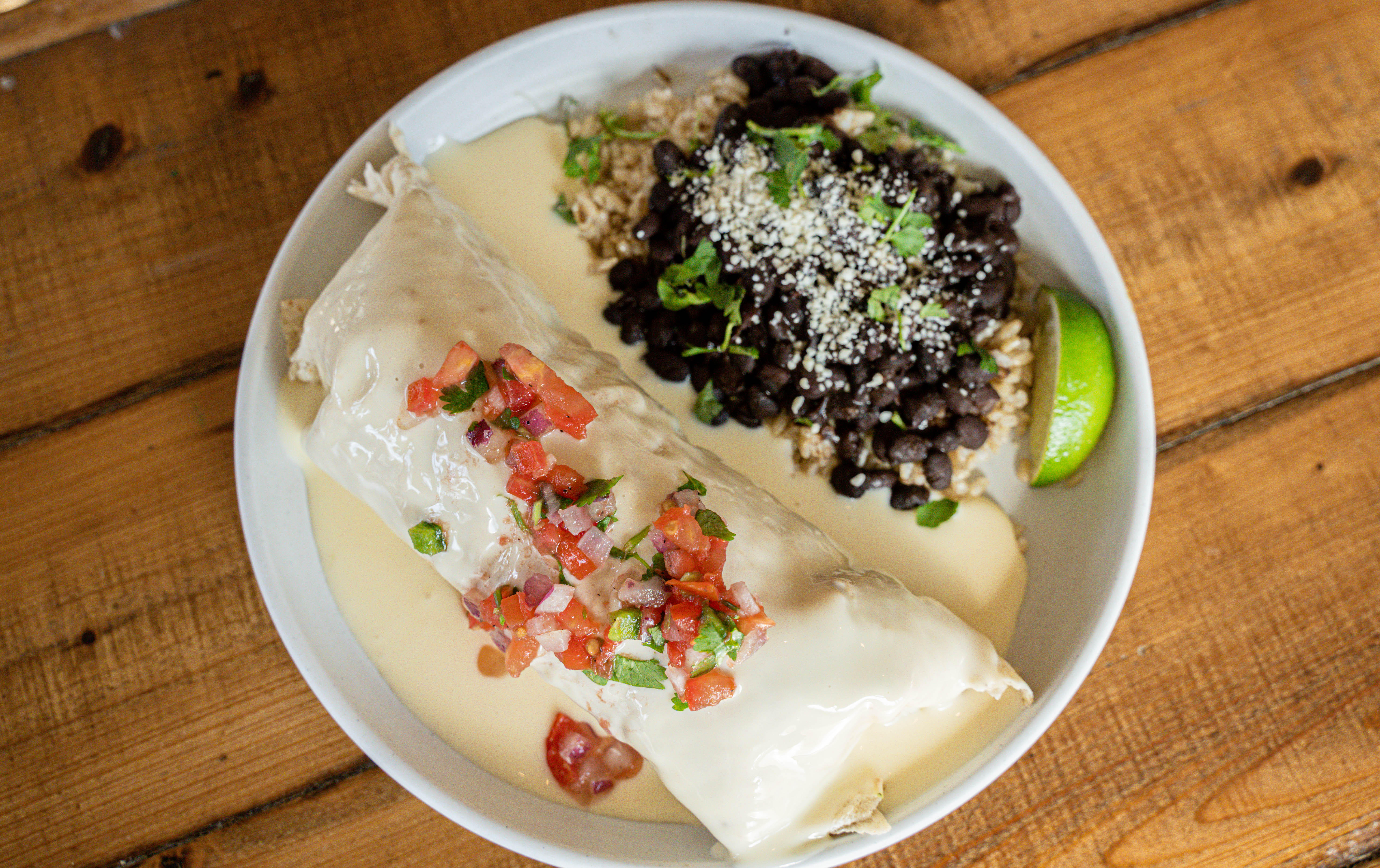 Braised pork camitas & jack cheese rolled into con tortillas with guacamole, pico de gallo, lettuce, cotija & jack cheese and chipotle mayo
